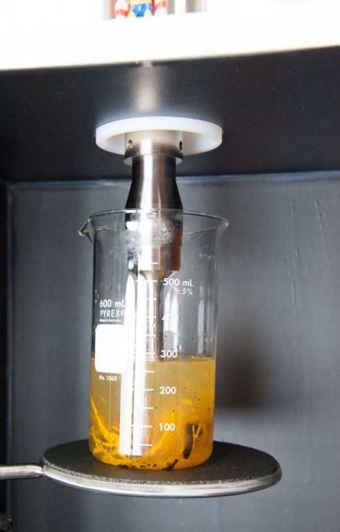 Here is the alcohol. First through the SonicPrep to disrupt the cells of the vanilla beans and orange zest. What it does is it just allows for more and faster infusion. Think grinding at a cellular level.