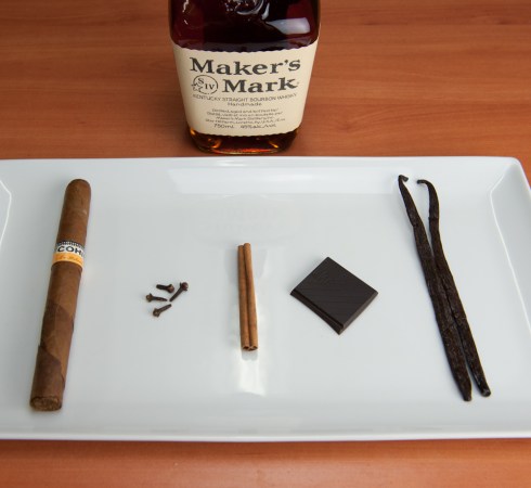 These are the ingredients I chose to work with. Bourbon, an old cigar (barely any flavour left. Next attempt will be with a fresh one), vanilla beans, chocolate, clove and cinnamon. These are the same ingredients people claim to smell in Tobacco Vanille.