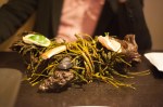 1. oyster leaf, mussel, razor clam and crab served on seaweed and drift wood.