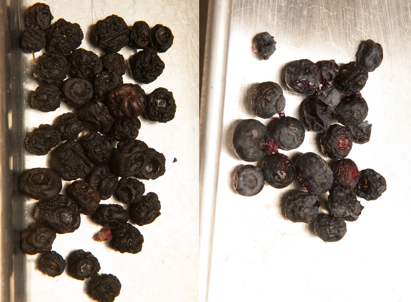 Here you can see that colours are different, and there is less shriveling on the blueberries from the freeze dryer.