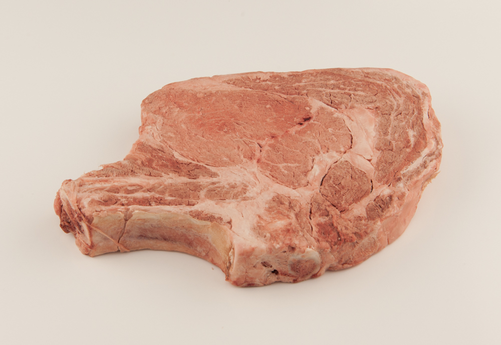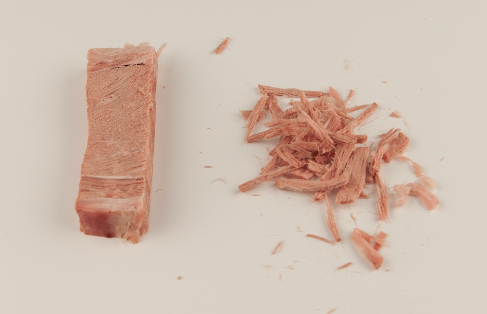 So first off we slice the steak. It’s quite easy to slice. I was expecting it to be challenging thinking that it might be very brittle. It was brittle, but it seems the muscle fibres are able to hold a structure to keep it from simply crumbling apart. Pulling it apart, though, was quite easy and what you get are tiny tiny fibers of muscle that seem to just flake off, and the larger chunks.