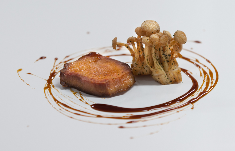 The reduction was first semi reduced (the only reason for doing this is so that the amount will fit into the centrifuge vials), then centrifuged to remove the solids. Once clear, its reduced until it’s really really sticky. Finished with some aged balsamic, cassis, and seasoning.