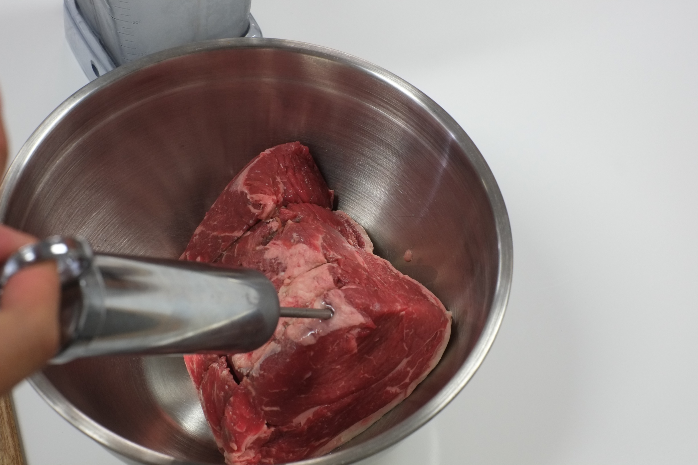 First, add salt to the water. Then add ice. By having salt dissolved in the water, this will lower the melting point of the ice, allowing the mixture to be liquid at even lower temperatures. Go for a 70/30 or 80/20 ratio of water to ice. Then, add the carrageenan. Once thats done, inject as much as you want into the meat. Obviously you don’t want to add too much to the meat. You don’t want a meat thats way too watery.