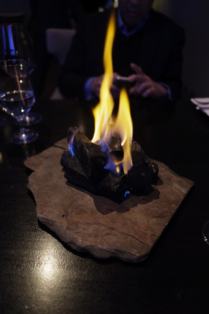 This perhaps exemplifies multisensory and emotional dining. Who would even imagine having a pile of burning coals in front of diners, and on the damn table itself. This was their center-piece. Knowing Alinea, I knew something was up. I knew this was more than just a pile of coals to burn. And I was right. To not give away too much, it becomes part of a dish later on that night.
