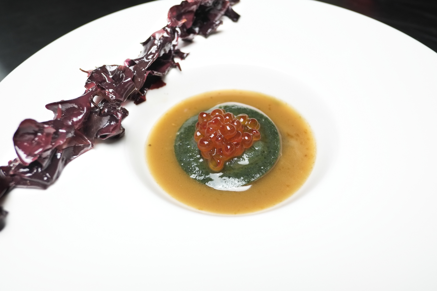 The pairing was the starting point of this dish. I also wanted to express the aroma of the sea, and thats where the dulce came in. The ramen broth is there simply because I had some left over, and it seemed like a good idea. And it turned out to be a great component to the dish.